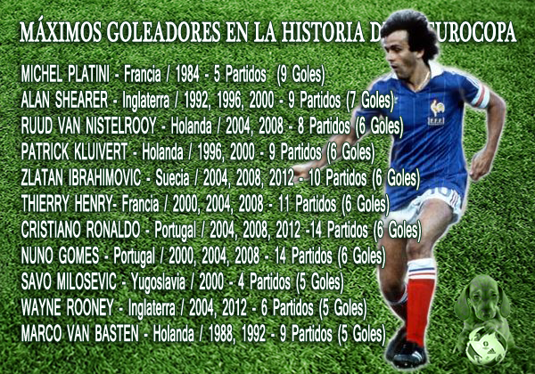 El genio francés anotó 9 goles en la Euro del '84 y hasta ahora nadie ha podido destronarlo, el luso y el buen Wayne llegan a esta cita europea con 6 y 5 goles respectivamente, Cristiano en 14 partidos en tres Eurocopas, mientras que el inglés en 6 partidos en 2 Euros .. ¿Podran destronar a la leyenda francesa en esta Eurocopa? ... ¡¡y todavia se juega en Francia!!
